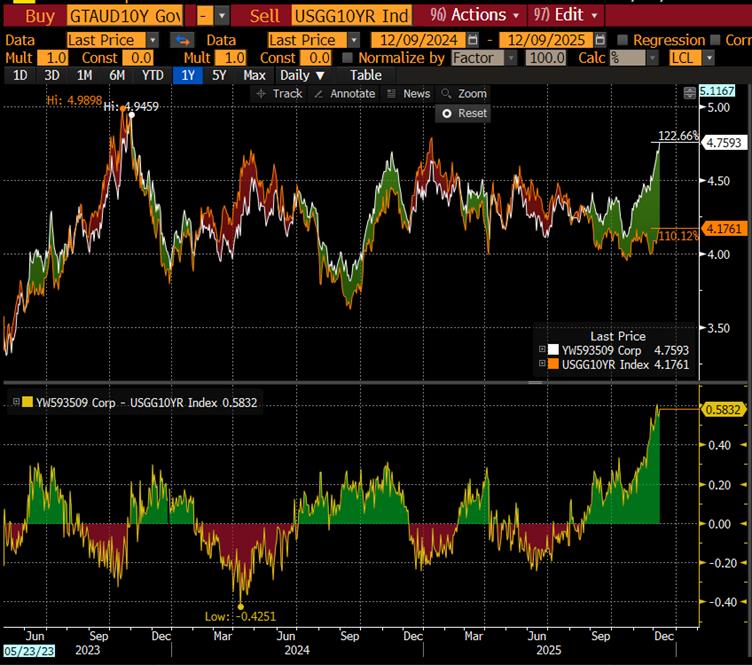 Australia’s hawkish pivot is ripping through global rates. Bullock’s “no cuts for the foreseeable future” stance has catapulted AU 10-year yields to the top of the developed-market league table, widening the AU–US spread to the highest since early 2022. With Q4 CPI now the swing factor for a potential RBA hike in May, divergence versus a Fed still cutting has become the dominant theme. The 10-year differential (Figure 1) shows Australia breaking away, dragging AUD higher.