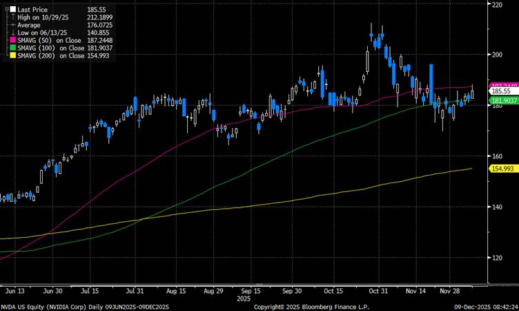 Trump permits sales of Nvidia H200 chips to China, though Nvidia share price reaction was muted, up 1.7% yesterday. Nvidia shares are still 12.5% down from record high at end of October, while S&P 500 index is just 1.1% off its late-October high. Globally, indices remain near record highs: Kopsi just 2% down, Nikkei 3.3% down.