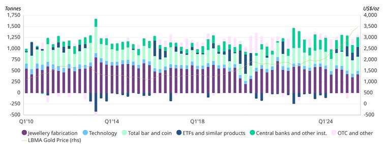 Gold demand hit a record 1,313 t in Q3 (+3% y/y), worth $146 bn (+44%), as investors added 222t and central banks holdings were up 28% q/q, while jewellery slumped. Supply also hit records, with mine output up 2%, as gold averaged $3,456/oz (Chart 3, World Gold Council).