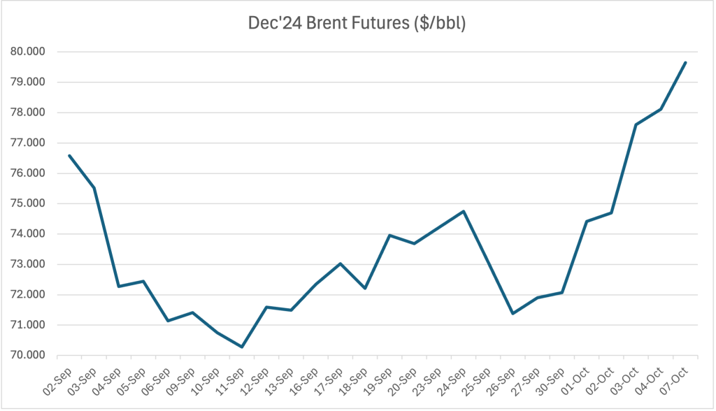The Dec’24 Brent futures contract fell below $78.00/bbl on Friday evening but again rallied to $79.65/bbl on 07 Oct at 10:40 BST (time of writing). Volatility remains elevated in the benchmark crude futures contract, leading us to assume a broader range for Brent futures by the end of this week, estimated between $76-81/bbl. Vital drivers that we expect will impact this week’s price action include: