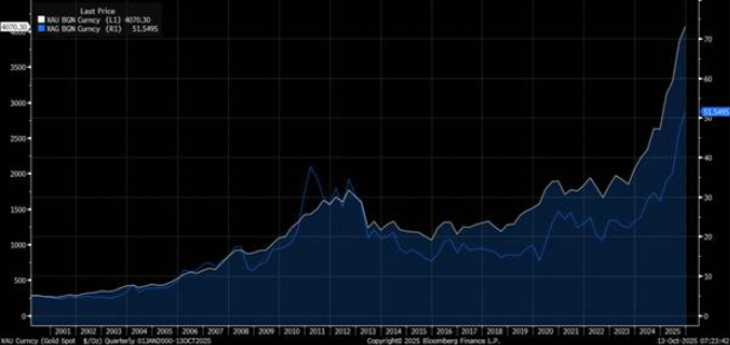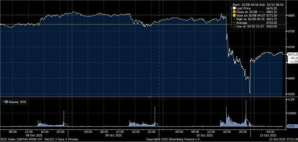 10-year US Treasury yields sank, gold hit fresh records, and equities sold off hard. But weekend comments from both sides struck a de-escalatory tone – TACO time. Trump said on Truth Social “Highly respected President Xi just had a bad moment. He doesn’t want Depression for his country, and neither do I.” That tone was enough to lift S&P mini futures +1.3%, reversing part of Friday’s 2.7% slump, which was itself the steepest drop since April (Figure 2, Bloomberg).