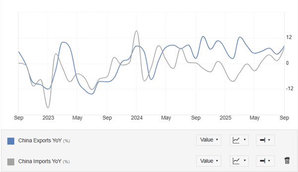 China’s September trade data surprised sharply to the upside. Exports surged 8.3% y/y to $328.6bn, well above the 6.6% consensus, while imports rose 7.4% y/y, beating expectations for 1.8% and reversing August’s soft patch (Figure 1, TradingEconomics). The strength points to resilient global demand and aggressive front-loading ahead of possible tariff escalations. Still, beneath the headline, the geographic breakdown tells the real story: exports to the US collapsed 27% y/y, extending August’s 33% plunge, while shipments to the EU jumped 14.2% and those to Southeast Asia 15.6%, underscoring how China is rerouting supply chains around American tariffs.