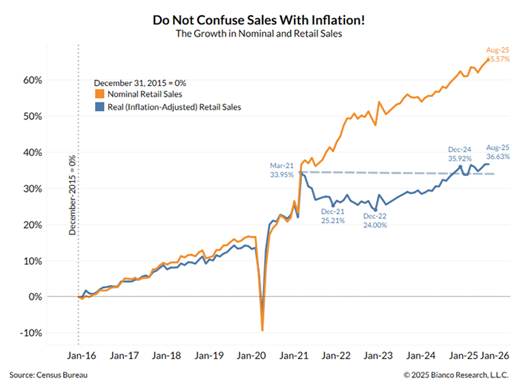 Pay more, get less: “US sales on Black Friday hit $18 billion, up 3% compared with a year earlier…. But US shoppers purchased 2% fewer items at checkout, and with average prices up 7%, shoppers made 1% fewer online orders.” (Chart 2, Census Bureau, Bianco Research)