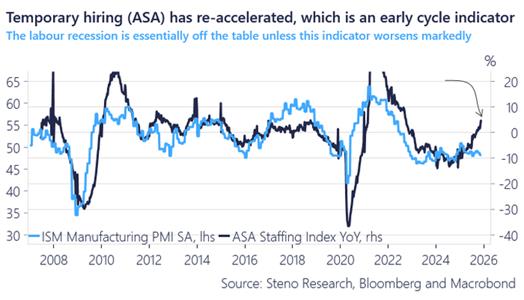 - U.S. temporary hiring has re-accelerated, perhaps an early signal we may be coming out of the slowdown. (Chart 1, Steno Research, Macrobond, Bloomberg)