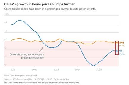 New-home prices in China fell -2.4% YoY in November, marking a severe acceleration in declines. Secondary home prices plunged across all city tiers, with first-tier cities recording a -5.8% YoY drop, while second tier and third-tier cities fell -5.6% and -5.8%, respectively. China’s real estate market has been in a downturn since mid-2021. (Chart 2, LSEG DataStream, Sumanta Sen, Kobeissi Letter)