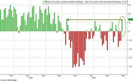 Bullish investor sentiment is surging, in fact the gap between bullish and bearish readings jumped to 13.5 points, the 2nd-highest this year. (Chart 4, Bloomberg, zerohedge)