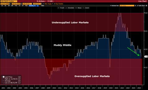 While yesterday’s JOLTS (job openings) rate ticked up the bigger story is the QUITS rate fell sharply, and at 1.8% (lowest since May 2020) this is heading towards oversupplied territory (Chart 1, @lebas_janney, Bloomberg).