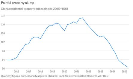 More Chinese data censorship. While China’s property slump continues Beijing had told the two private sector housing data agencies (China Real Estate Information (CREI) & the China Index Academy) to withhold the numbers until further notice. (Chart 3, Telegraph, BIS, FRED)