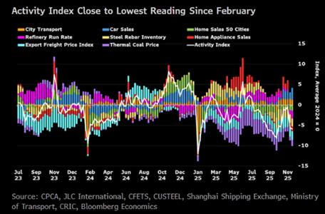Economic activity in China likely slowed further in November, with the high-frequency index and dashboard showing a sharp drop in the second half of the month. Sales of new homes and home appliances led the deterioration in demand, with new-home sales falling 41% year on year in the four weeks through Nov. 28. (Chart 2, @dlacalle_IA, Bloomberg economics)