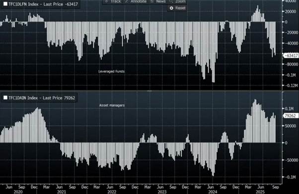 Positioning in yen is split: asset managers lifted JPY longs to +79k, while leveraged funds expanded shorts to -63k. (Figure 2)