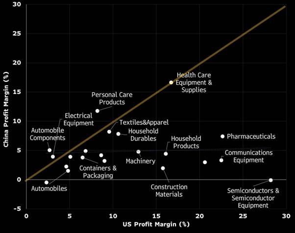 Corporate profitability data highlights the yawning gap between US and Chinese firms. Tradable-goods companies in the US posted average margins of 12.4% in 2024, versus 4.9% in China according to Bloomberg data. High-tech leads the spread: US communications equipment at 22.5% vs China 3.3%, hardware at 20.6% vs 3.0%, and pharma at 22.6% vs 7.4%. Construction and household products also show double-digit gaps, mostly reflecting weak Chinese demand. Margins in consumer goods like textiles (9.6% vs 8.2%) and leisure equipment (4.6% vs 2.2%) are much closer. (Figure 4)
