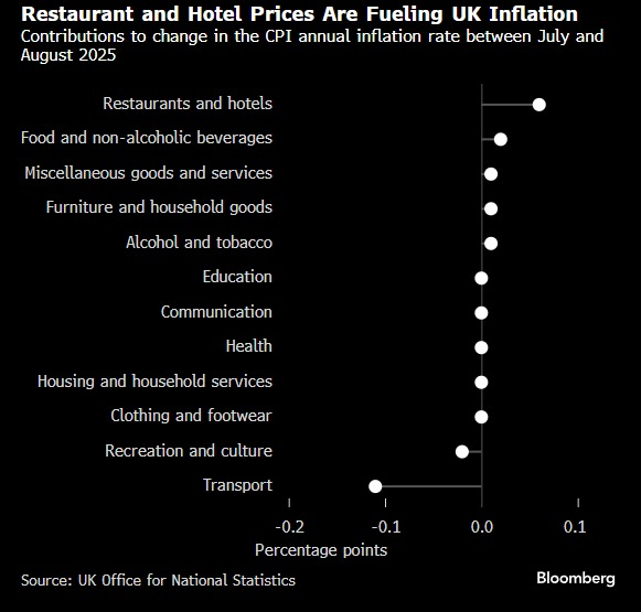In the UK, inflation held at +3.8% y/y (unchanged from July), its highest level in over 1.5 years. Downward pressure from air fares was offset by motor fuel and prices at restaurants and hotels. Food inflation hit +4.8%, its highest level since early 2024.