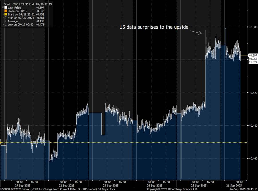 Fresh labour market data revealed jobless claims fell to their lowest since mid-July and unemployment claims slipped by 14k to 218k, far below expectations. Most firms are clinging to workers despite slower hiring, keeping the labour market cooler but intact. Markets now pricing less Fed cutting after strong macro prints in the US, with OIS now pricing under 40 bps. They also expect the Fed’s neutral rate – where policy is neither boosting nor slowing growth – to settle near 3%, higher than before.