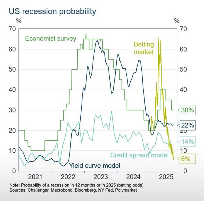 Bets on US recession have dropped from a high of over 60% early this year to 6% now on Polymarket. (Figure 1)