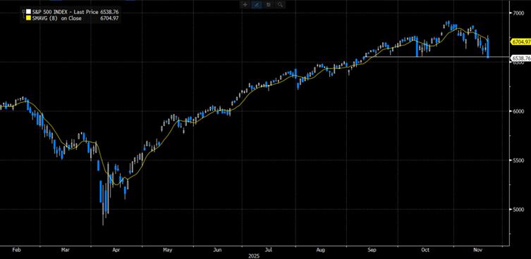 Both S&P 500 and the Nasdaq close below key support, S&P 6,552. (Chart 1, Bloomberg) Let’s, see how today plays out, but remember retail traders have record long positions while hedge funds have been short and will add to shorts here. If equities can’t rally on good news ……..