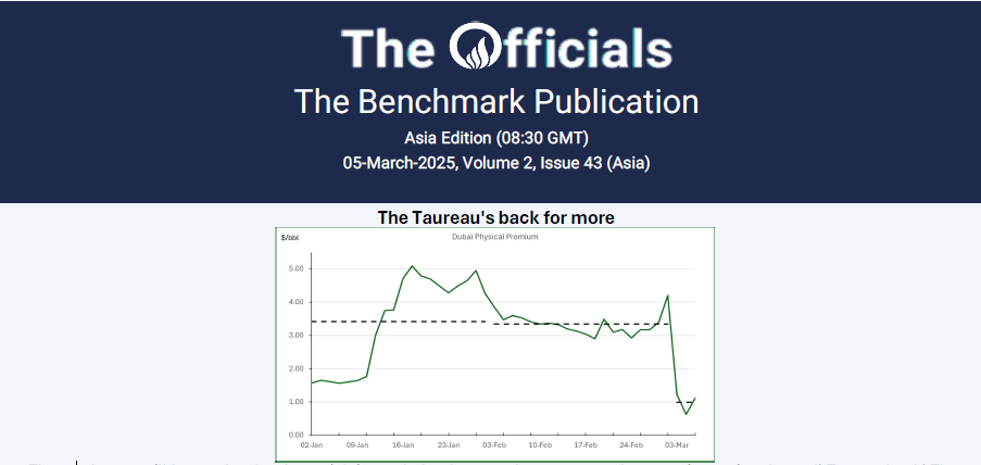 The producers will have a bottle of Beaujolais ready for the French as soon as the new vintage is released! Totsa’s back! The Dubai window hadn’t been the same without the Taureau, as serious buyers were few and far between throughout February. But today the French struck back, returning in force to place plenty of bids. Vitol remained on the buyside, while Gunvor joined in too. After trying its hand at some selling in February, Chevron popped over to buy as well. It was all too much for an isolated PetroChina on the sellside. When the Taureau’s on the rampage, nobody can stop him collecting his Camembert. The Dubai physical premium bounced from yesterday’s low of 63c, back up to $1.12. PetroChina made an admirable effort on the sellside but was overwhelmed by the horde of buyers throwing in bids.