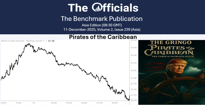Shiver our timbers! The late American session had Brent climbing all the way to $62.70 after the Venezuelan tanker hijacking. But the Asians don’t care and it fell steadily through their trading this morning, back to $61.60/bbl by the close. As one Chinese source said, “Venezuelan just happens to be cheap”. It’s not a coincidence that Venezuelan is so cheap, as only China touches it!