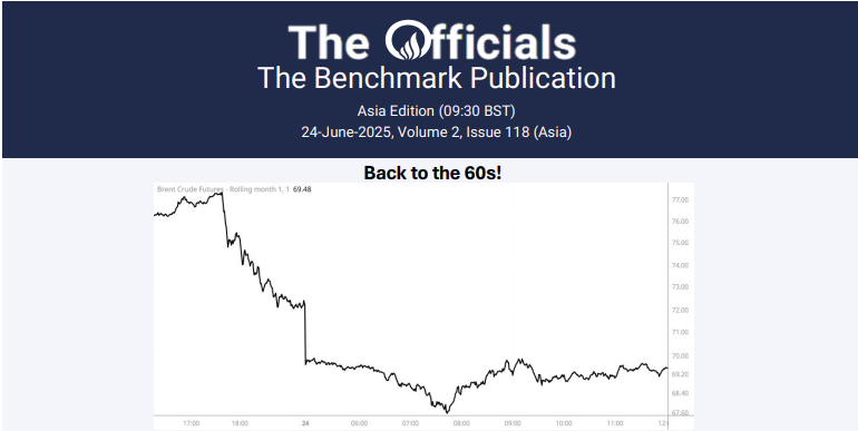 Back to the 60s! The ceasefire between Israel and Iran double tapped flat price after yesterday evening’s plunge. Having ended yesterday’s trading above $72, it dropped to open today at $69.60. We were talking yesterday about how the spreads also had to weaken from their inflated and bulked up position near $1.50 and we saw evidence of that today, as the prompt spread dropped to below a buck, reaching the Asian close at 92c.