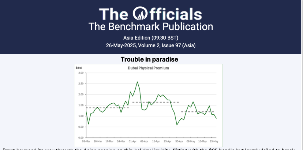 Brent bounced its way through the Asian session through thin holiday liquidity, flirting with the $65 handle but largely failed to break convincingly higher. Despite Trumps optimism on “very good” US-Iran talks, we are still awaiting any sort of break through. On Friday Iran reiterated that they would not concede on uranium enrichment for domestic use, but nevertheless, Trump said to upon his return “I don’t know if I’ll be telling you anything good or bad over the next two days, but I have a feeling I might be telling you something good.” Oh and Trump’s decided to postpone the threatened 50% EU tariffs until 9th July. For now at least, the market is in wait and see mode. Who can blame traders for not reading too much into the Trump-talk, they’ve been burned in the past for that. Crude remains somewhat supported, at least if you look at Brent flat price, which closed at $65.08/bbl up $1.15 on the day. And Brent structures too, with front spreads still robustly backwardated at 63c.