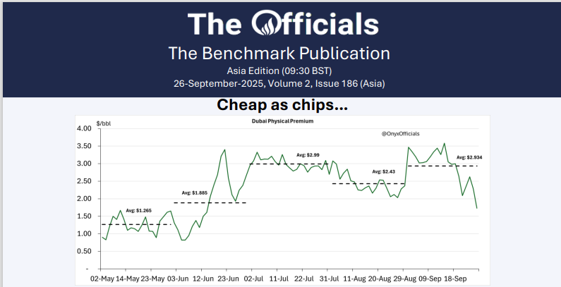 The big news this month: the prompt Dated/Dubai swap has flipped back to positive territory for the first time since mid-August. We were wondering yesterday who let the bulls out in the North Sea; those same bulls wanted to keep a low profile in the Dubai window and decided it was time for Dated’s comeback. The October Dated/Dubai swap was trading as high as 15c in the early trading before partially retracing to 2c by the Asian close – that still a hefty 33c higher than yesterday! One trader was getting excited about his flies too, the Oct/Nov/Dec Dubai fly dumped from 75c on Monday to 35c yesterday!