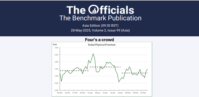 Don’t believe what the West says, China is not alone and has many friends! The Dubai window showed PetroChina isn’t entirely isolated on the buyside, as Phillips showed up to lift a few partials from the likes of BP and Totsa. And that makes the Gang of Four. But, as ever, it was PC doing the lion’s share of the work, bidding with as much vigour as ever! Vitol was back as the main seller, though joined by Totsa and BP, while Reliance and Gunvor skirted around the edges of the sellside and buyside, respectively. The more active buyside today saw the physical premium continued its upward momentum to hit $1.49 today – its highest since 9 May. In the end, Vitol nominated an Oman cargo to PC, the third of the grade this month. Clearly the Murban stores at Vitol have dried up, as they’ve only nominated one of those since 16 May.