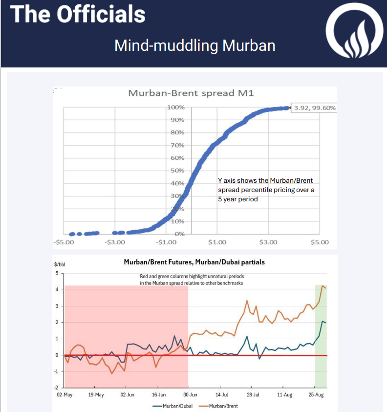 Which one is the odd one out? Well, the figures show that Murban soared by more than twice the level of Brent and WTI. Why, may you ask? Join us in that quandary because the behaviour is very weird – as in unusual. One of our sources contributed this graph showing that “right now the Murban Brent spread is pricing at 99th percentile.” This spread behaviour is super uncommon. But why?