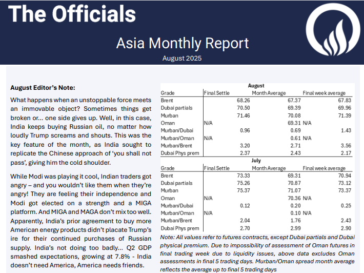 What happens when an unstoppable force meets an immovable object? Sometimes things get broken or… one side gives up. Well, in this case, India keeps buying Russian oil, no matter how loudly Trump screams and shouts. This was the key feature of the month, as India sought to replicate the Chinese approach of ‘you shall not pass’, giving him the cold shoulder. While Modi was playing it cool, Indian traders got angry – and you wouldn’t like them when they’re angry! They are feeling their independence and Modi got elected on a strength and a MIGA platform. And MIGA and MAGA don’t mix too well. Apparently, India’s prior agreement to buy more American energy products didn’t placate Trump’s ire for their continued purchases of Russian supply. India’s not doing too badly… Q2 GDP smashed expectations, growing at 7.8% – India doesn’t need America, America needs friends.