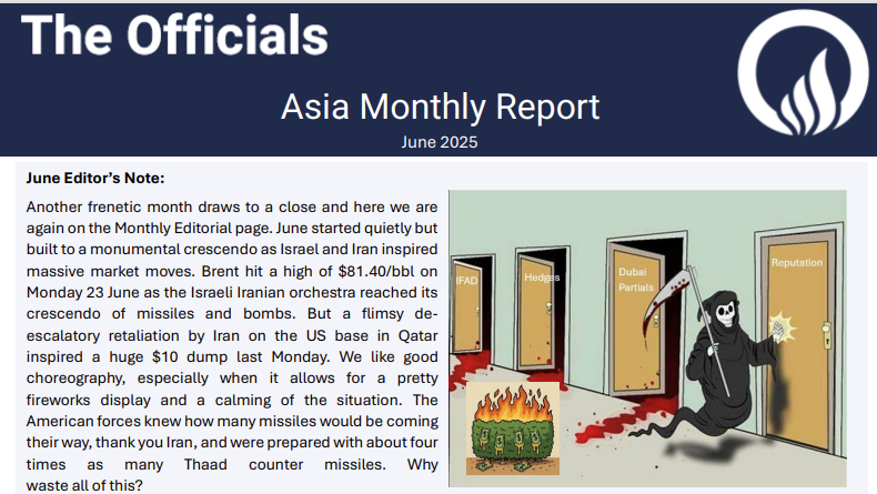 Another frenetic month draws to a close and here we are again on the Monthly Editorial page. June started quietly but built to a monumental crescendo as Israel and Iran inspired massive market moves. Brent hit a high of $81.40/bbl on Monday 23 June as the Israeli Iranian orchestra reached its crescendo of missiles and bombs. But a flimsy de-escalatory retaliation by Iran on the US base in Qatar inspired a huge $10 dump last Monday. We like good choreography, especially when it allows for a pretty fireworks display and a calming of the situation. The American forces knew how many missiles would be coming their way, thank you Iran, and were prepared with about four times as many Thaad counter missiles. Why waste all of this?