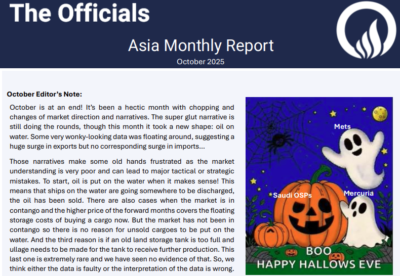 October is at an end! It’s been a hectic month with chopping and changes of market direction and narratives. The super glut narrative is still doing the rounds, though this month it took a new shape: oil on water. Some very wonky-looking data was floating around, suggesting a huge surge in exports but no corresponding surge in imports…