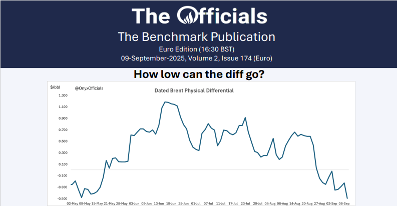 Dated dive bombed, this is the lowest physical differential since The Officials began Dated Brent assessments!! Brent finally cleared, with Gunvor lifting Mercuria’s discounted CIF 30 Sep-4 Oct cargo at $1.30 over Dated. Mercuria was happy with that and then withdrew its FOB 22-24 Sep Brent offer at Dated -$0.80. Meanwhile, Trafi and Exxon offered Forties for 23-25 Sep and 26-28 Sep at Dated +$0.20 and Dated -$0.20, respectively. Ekofisk was offered too, with Shell going as low as Dated +$2.30 for a CIF 1-5 Oct cargo, while Mercuria offered FOB Sep 29-1 Oct at $1.25 over Dated. The physical differential hit rock bottom at -49.5c.