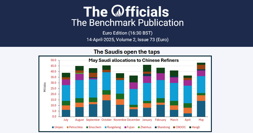 48 mil bbl! Mega! A huge set of Saudi allocations to Chinese refiners. A record breaker in fact, at least since The Officials publication began in June 2024. That’s a lot of crude shifting to the East. Rongsheng got the biggest share with a 15 mil bbl allocation but it was Unipec’s monthly change that grabs the eye: from only 3 mil bbl in April, they’ve surged to 14 mil bbl for May!