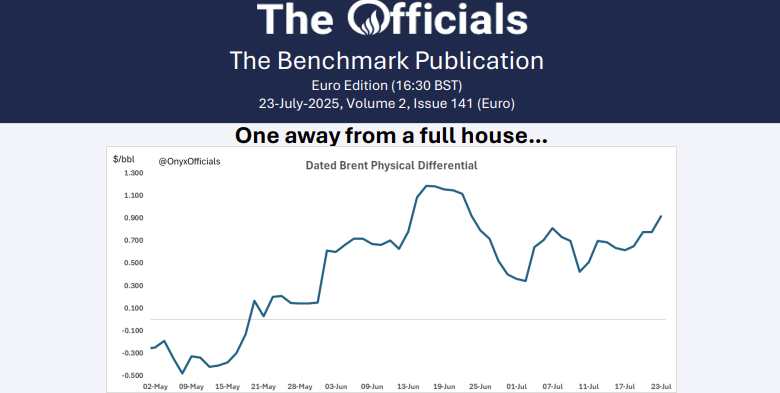 The flat price was boring with Sep Brent trying desperately to pierce the $68.00/bbl to just bounce up again and again. In contrast, the window got messy and the Dated differential climbed 14c/bbl, after a brief respite yesterday when it held steady. Bids and offers were thrown around the window like frozen buns in a real food fight – with Midland setting the curve throughout. Chevron was there bartering its wares, offering two Midland cargoes, while PetroIneos offered one of its own. Exxon and Totsa returned to bid. Then Gunvor burst in to bid for Ekofisk, Forties and Brent, while Equinor offered Oseberg. Mercuria and Phillips were bidding and offering Ekofisk, respectively. At least one bid or offer for all but one of the BFOETM grades! We only lacked a Troll to get the full set.