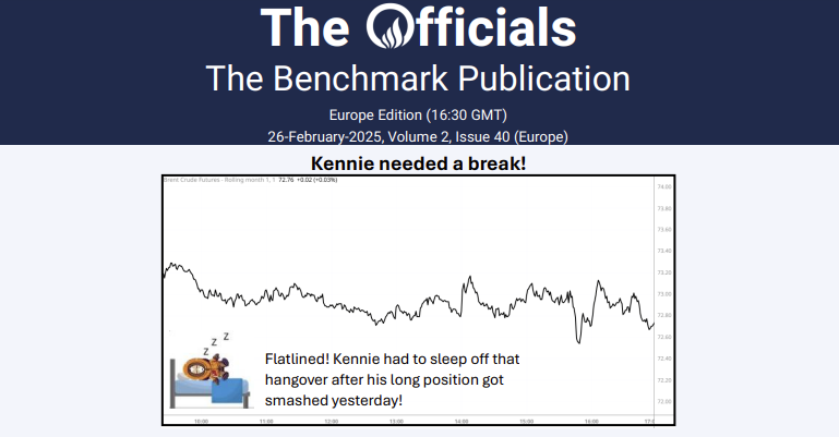 The North Sea window was almost as quiet as Dubai today. Only Mercuria rolled in to offer. Hey, if you buy a full VLCC’s worth of Midland in one window, you’ve got to offload it somehow… The offer of a 10-14 March at Dated +$1 didn’t attract any interest from lethargic buyers busy planning their next IE week outings.