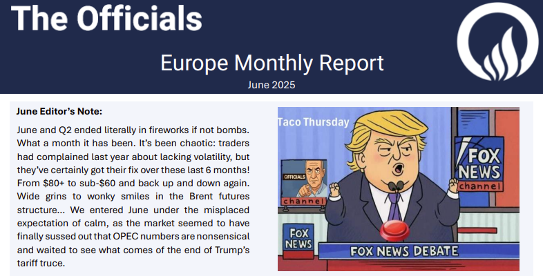 June and Q2 ended literally in fireworks if not bombs. What a month it has been. It’s been chaotic: traders had complained last year about lacking volatility, but they’ve certainly got their fix over these last 6 months! From $80+ to sub-$60 and back up and down again. Wide grins to wonky smiles in the Brent futures structure… We entered June under the misplaced expectation of calm, as the market seemed to have finally sussed out that OPEC numbers are nonsensical and waited to see what comes of the end of Trump’s tariff truce.