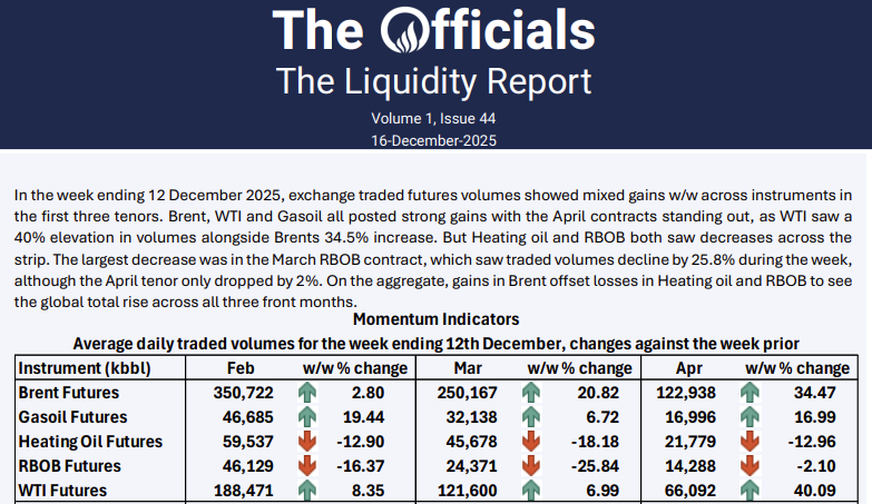 In the week ending 12 December 2025, exchange traded futures volumes showed mixed gains w/w across instruments in the first three tenors. Brent, WTI and Gasoil all posted strong gains with the April contracts standing out, as WTI saw a 40% elevation in volumes alongside Brents 34.5% increase. But Heating oil and RBOB both saw decreases across the strip