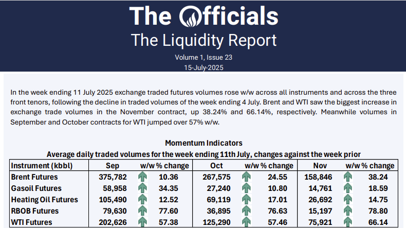 In the week ending 11 July 2025 exchange traded futures volumes rose w/w across all instruments and across the three front tenors, following the decline in traded volumes of the week ending 4 July. Brent and WTI saw the biggest increase in exchange trade volumes in the November contract, up 38.24% and 66.14%, respectively. Meanwhile volumes in September and October contracts for WTI jumped over 57% w/w.