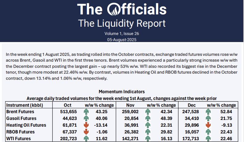 In the week ending 1 August 2025, as trading rolled into the October contracts, exchange traded futures volumes rose w/w across Brent, Gasoil and WTI in the first three tenors. Brent volumes experienced a particularly strong increase w/w with the December contract posting the largest gain – up nearly 53% w/w. WTI also recorded its biggest rise in the December tenor, though more modest at 22.46% w/w. By contrast, volumes in Heating Oil and RBOB futures declined in the October contract, down 13.14% and 1.06% w/w, respectively.