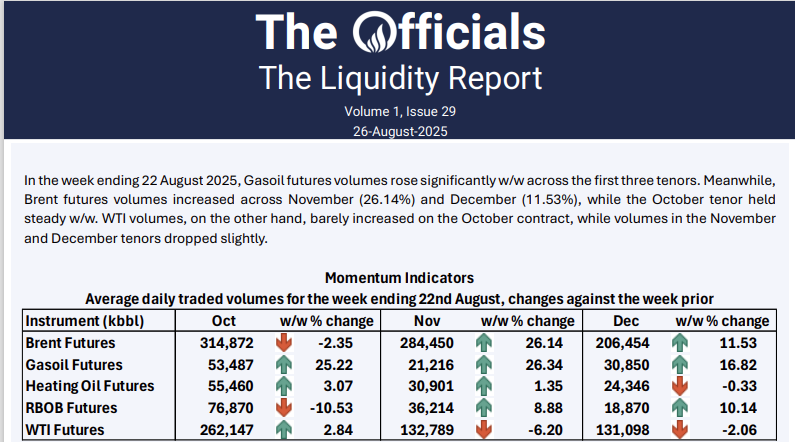 In the week ending 22 August 2025, Gasoil futures volumes rose significantly w/w across the first three tenors. Meanwhile, Brent futures volumes increased across November (26.14%) and December (11.53%), while the October tenor held steady w/w. WTI volumes, on the other hand, barely increased on the October contract, while volumes in the November and December tenors dropped slightly.