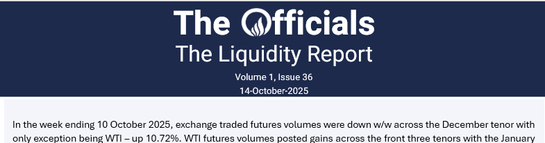 In the week ending 10 October 2025, exchange traded futures volumes were down w/w across the December tenor with only exception being WTI.