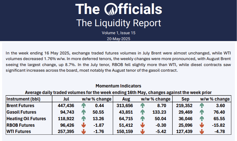 In the week ending 16 May 2025, exchange traded futures volumes in July Brent were almost unchanged, while WTI volumes decreased 1.76% w/w. In more deferred tenors, the weekly changes were more pronounced, with August Brent seeing the largest change, up 8.7%. In the July tenor, RBOB fell slightly more than WTI, while diesel contracts saw significant increases across the board, most notably the August tenor of the gasoil contract.