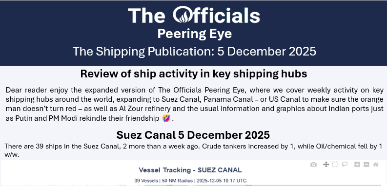 Dear reader enjoy the expanded version of The Officials Peering Eye, where we cover weekly activity in key shipping hubs around the world, expanding to Suez Canal, Panama Canal – or US Canal to make sure the orange man doesn’t turn red – as well as Al Zour refinery and the usual information and graphics about Indian ports just as Putin and PM Modi rekindle their friendship 🤣.