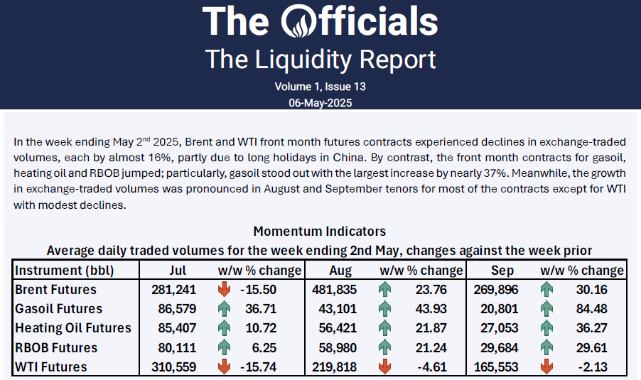 In the week ending May 2nd 2025, Brent and WTI front month futures contracts experienced declines in exchange-traded volumes, each by almost 16%, partly due to long holidays in China. By contrast, the front month contracts for gasoil, heating oil and RBOB jumped; particularly, gasoil stood out with the largest increase by nearly 37%. Meanwhile, the growth in exchange-traded volumes was pronounced in August and September tenors for most of the contracts except for WTI with modest declines.