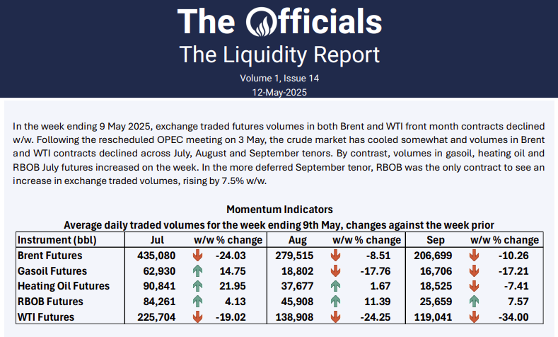 In the week ending 9 May 2025, exchange traded futures volumes in both Brent and WTI front month contracts declined w/w. Following the rescheduled OPEC meeting on 3 May, the crude market has cooled somewhat and volumes in Brent and WTI contracts declined across July, August and September tenors. By contrast, volumes in gasoil, heating oil and RBOB July futures increased on the week. In the more deferred September tenor, RBOB was the only contract to see an increase in exchange traded volumes, rising by 7.5% w/w.