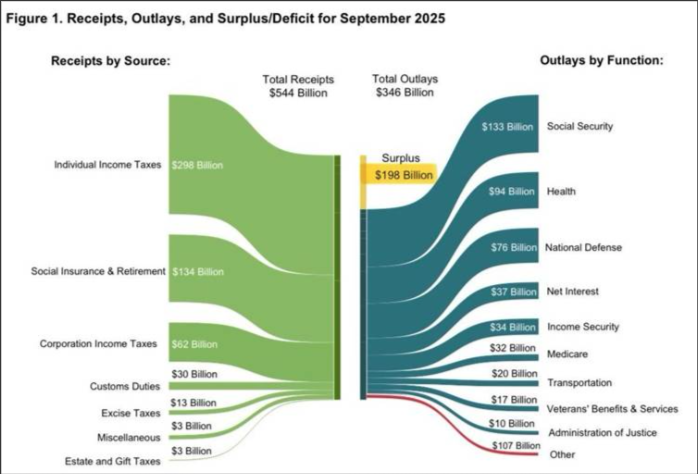 The US Treasury posted a $198 billion budget surplus in September – the largest on record for the month and nearly quadruple consensus estimates. Receipts surged to $544 billion, led by a jump in income and corporate tax payments, while outlays dropped to $346 billion. Customs receipts were at $30 billion, up more than fourfold from a year earlier due to Trump’s tariffs. Despite the strong close to the fiscal year, the FY2025 year-to-date deficit still stands at $1.78 trillion, only slightly below last year’s. (Graph 2, US Department of the Treasury)