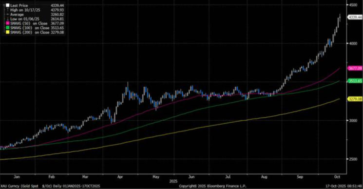Another day, another all-time high for Gold that peaked above $4376/oz (Graph 1, Bloomberg). The precious metal has added over $11 trillion in market value in 2025 alone, bringing its total worth to $25 trillion. Silver followed too, at a new all-time high of $54.45/oz.
