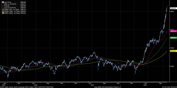 Also the KOSPI rose another 0.23%, setting a new all-time high and extending a 19% rally this month, as South Korea announced a blockbuster $350 billion trade package with the US (Figure 3, Bloomberg). The deal includes major Korean investment in U.S. shipbuilding and energy purchases, aimed at deepening industrial ties and securing long-term supply chains. The agreement follows an upbeat meeting between Presidents Trump and Xi in Korea, where the two leaders pledged to ease trade tensions and halve certain tariffs on Chinese goods – a move investors saw as supportive for global growth.