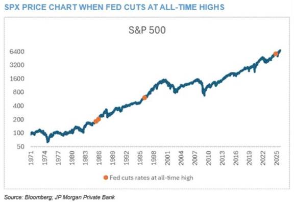 The Fed’s quarter point cut comes at a time when the SP500 is at all-time highs, the 5th time this has happened (figure 2, JP Morgan). In all prior instances the index was up a year on, with the worst one year return 15% and the average return 20%. To add fuel to the fire, the Fed will also be halting QT in December. In fact, they will reinvest all mortgage backed securities principals into treasury bills. If in doubt, print your way out.