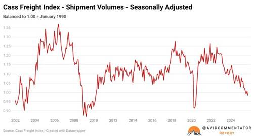 The Cass Freight Shipments index has hit yet another new low for the current cycle. (Chart 5, @AvidCommentator, Cass Freight Index)