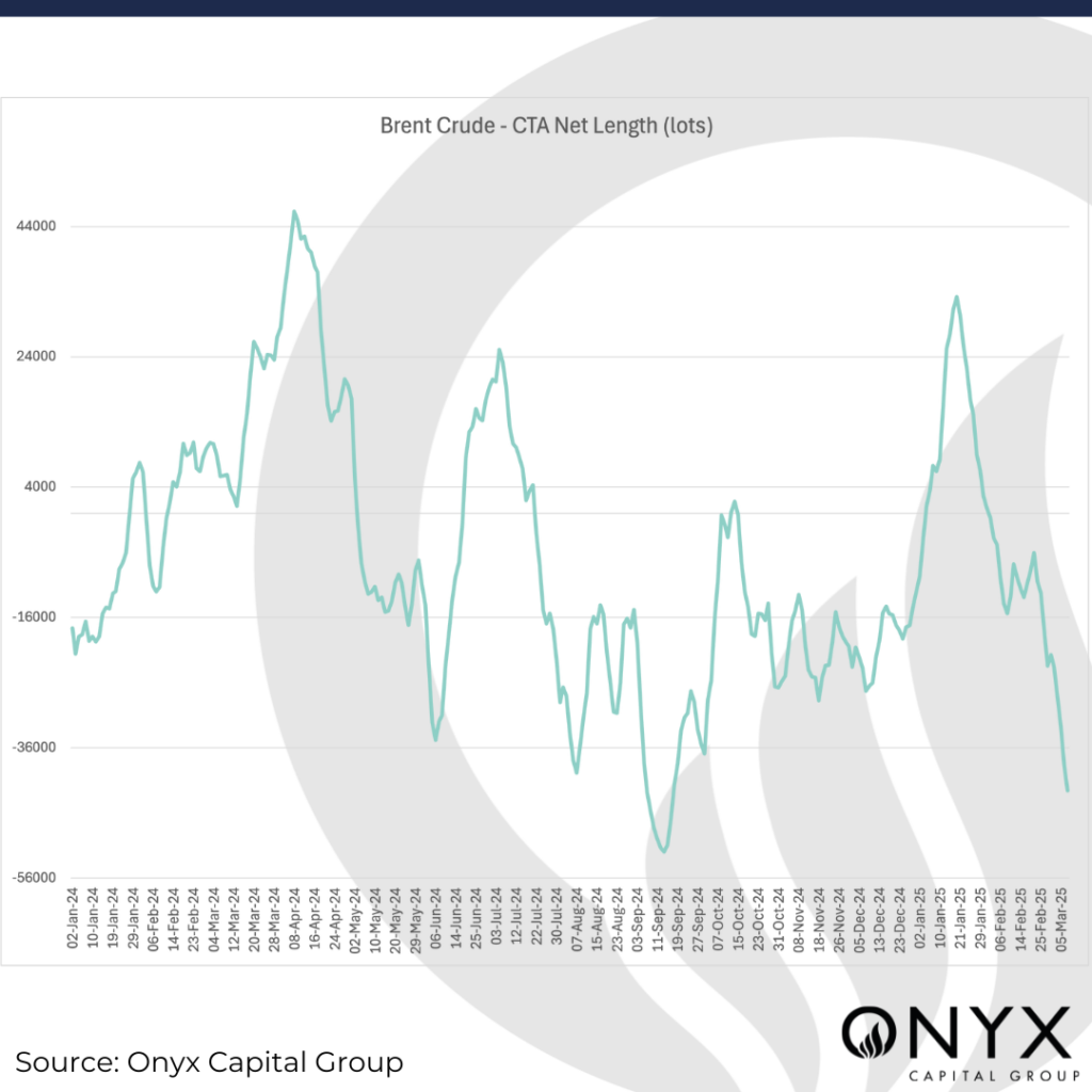 Looking at commitment of traders data, the ICE exchange reports for the week ending 4 March a 2.55% reduction of open interest w/w in ICE Brent futures. De-risking was evident in the money managers category of participants as these cut over 60mb from their net length, taking their long-to-short ratio to its lowest since November 2024. Onyx’s timelier CTA model also displays net positioning in ICE Brent declining from -21k lots on 28 Feb to -38k lots on 6 Mar. The paring of net length in the past successive weeks appears symptomatic of a market unwilling to assume a more neutral stance amidst the unpredictability of current conditions. However, should price-sensitive buyers like China come back into the fray and begin to push prices higher again, money managers could take the opportunity to ride their coattails.