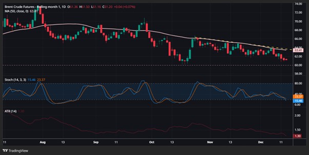 Last week, the Feb’26 Brent crude futures closed lower, falling from $63/bbl at the start of the week as prices test the $61/bbl support level. For the past two months, Brent has been slowly, but steadily, trending lower, with prices seeing lower lows and lower highs. As we enter the final full trading week of the year, we expect prices to grind lower but crucially find support at the $60/bbl level. The key factors are outlined in this forecast: